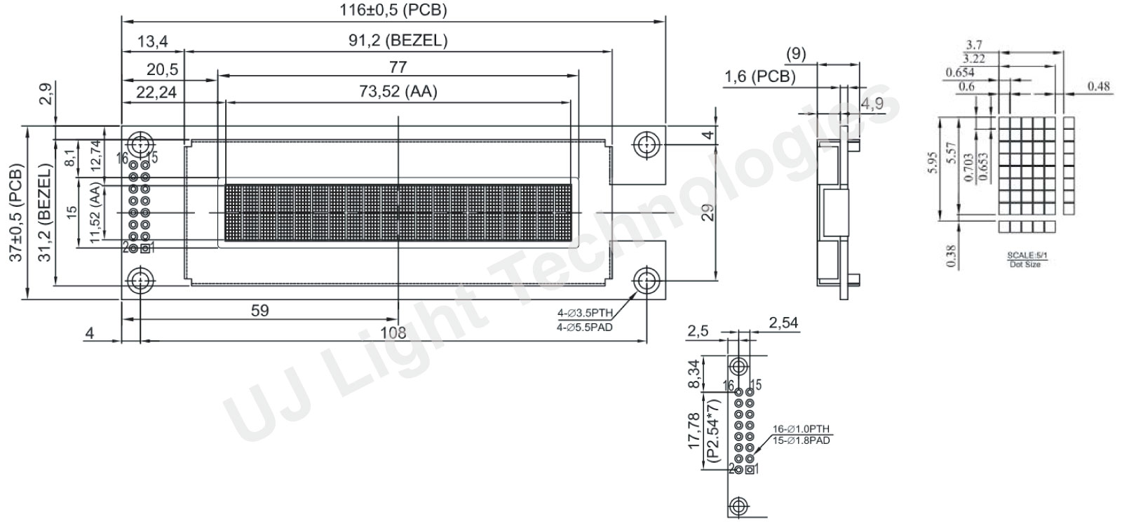 The module dimension 116.0 x 37.0 mm and active area is 73.52 x 11.52 mm.