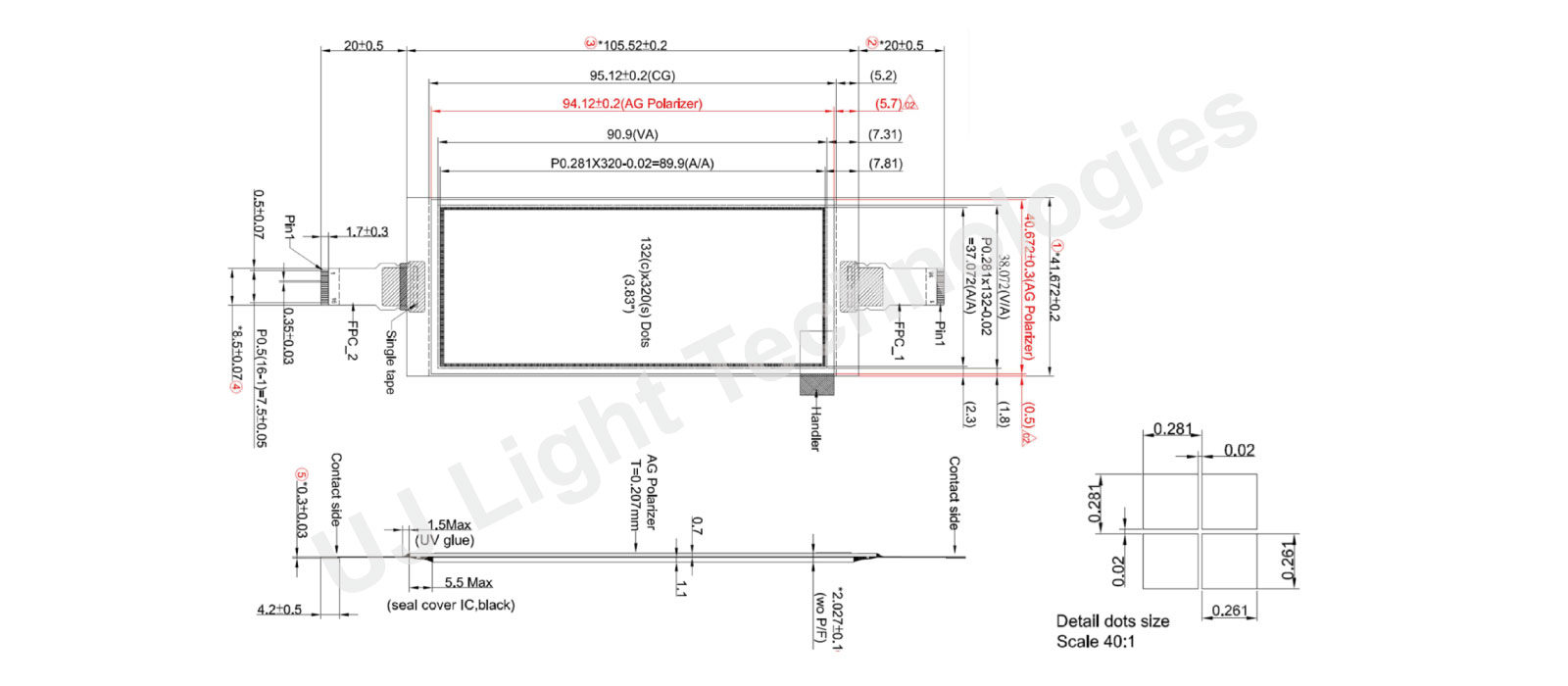 The module dimension of UL320132A is 145.52 X 41.672 mm and Active Area is 89.90 X 37.072 mm.