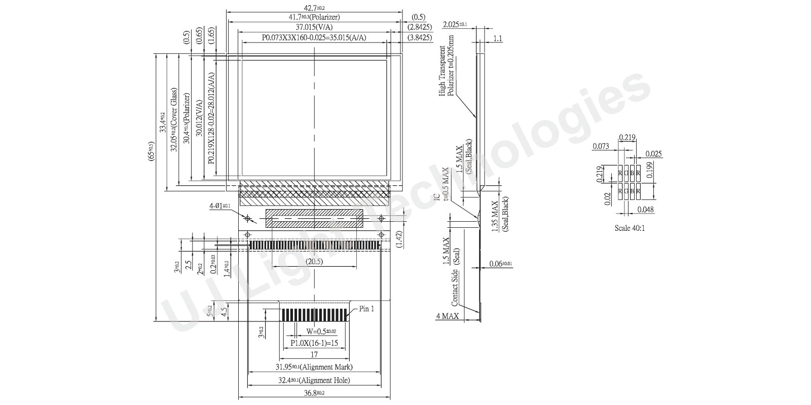 The module dimension of BL160128A is 42.7 x 33.4 mm and Active Area is 35.015 x 28.012 mm.