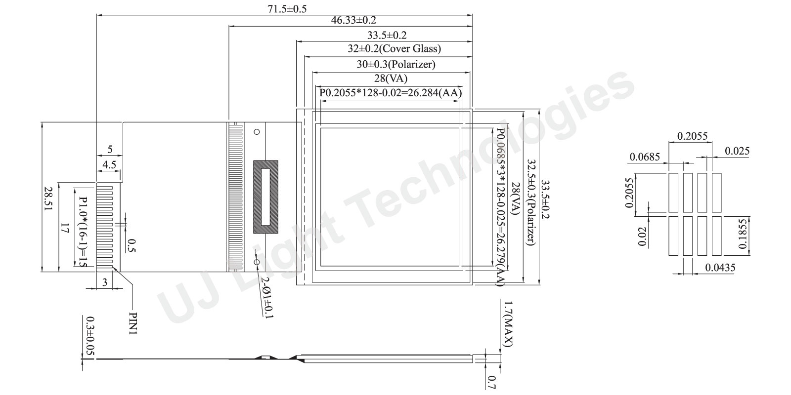 The module dimension of BL128128C3 is 28.0 x 28.0 mm and Active Area is 26.279 x 26.279 mm.