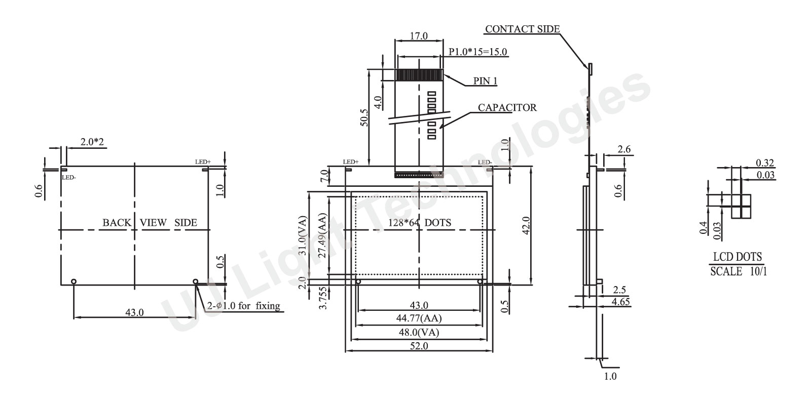 Module dimension of BO12864D1 is (52.0 x 42.0) mm and viewing area is (48.0 x 31.0) mm.
