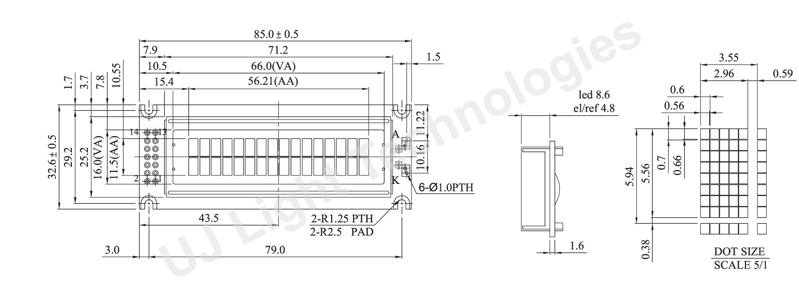 Module dimension of BC1602F is (85.0x32.6) mm and viewing area is (66.0x16.0) mm.
