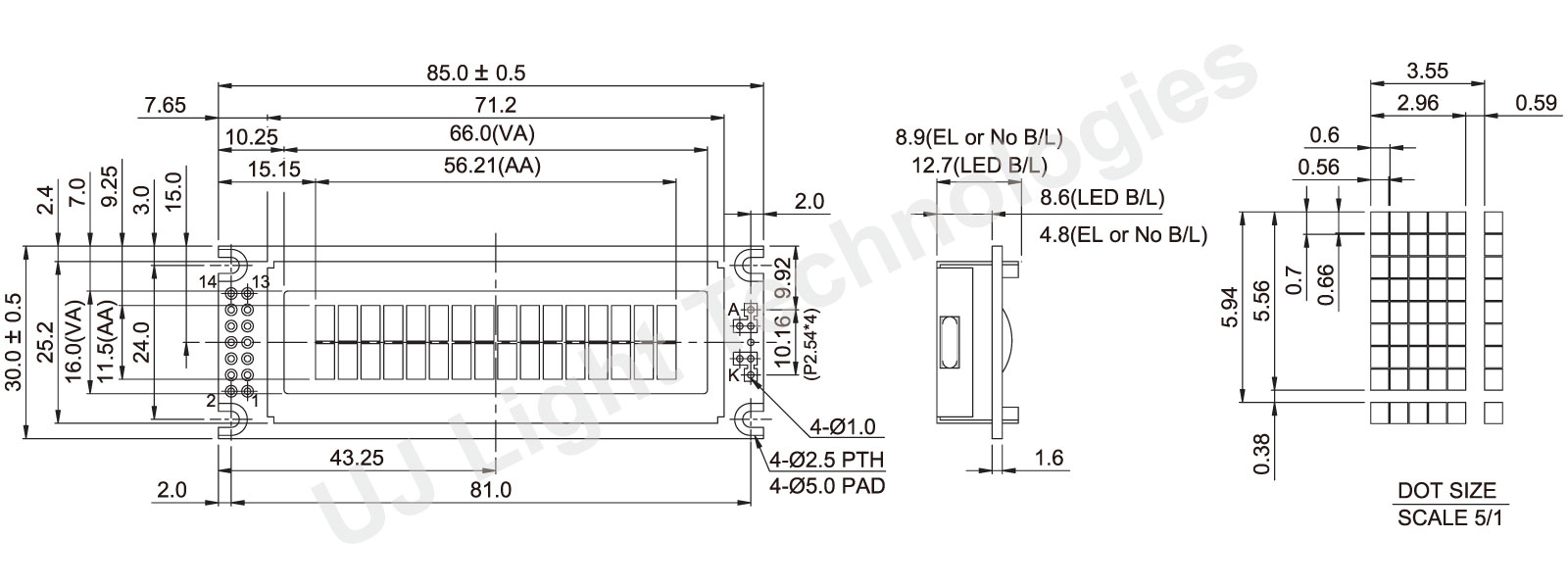 Module dimension of BC1602B is (85.0x30.00) mm and viewing area is (66.0x16.0) mm.