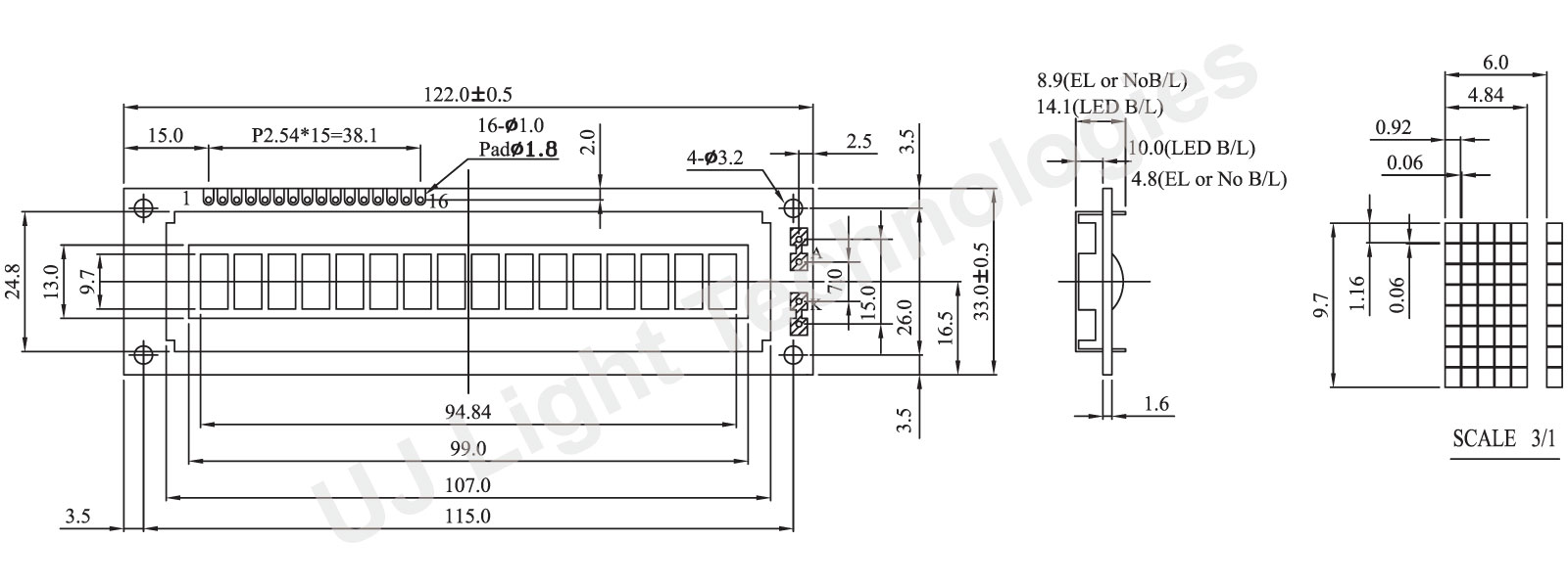 Module dimension of BC1601D is (122.0x33.0) mm and viewing area is (99.0x13.0) mm.