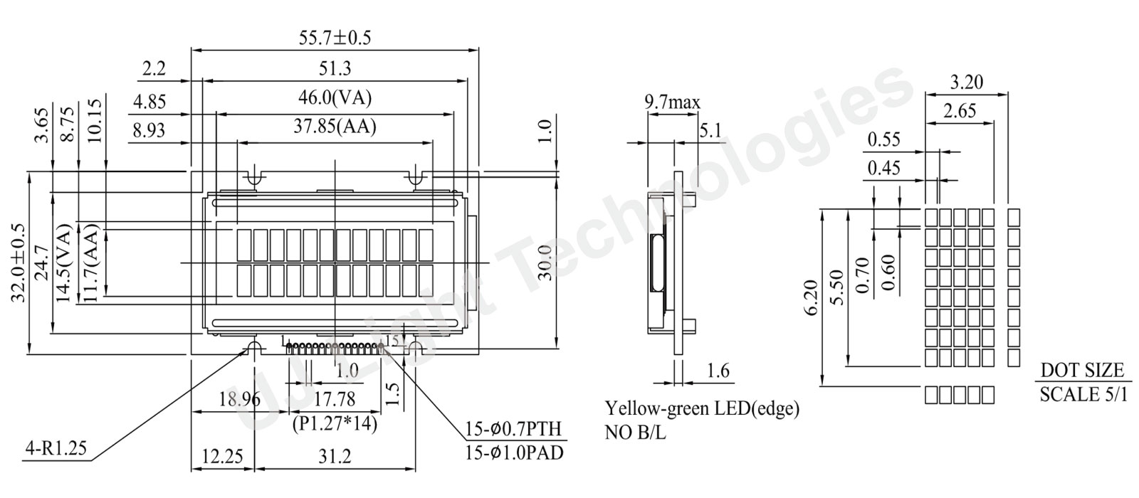 Module dimension of BC1202B is (55.7x32.0) mm and viewing area is (46x14.5) mm.