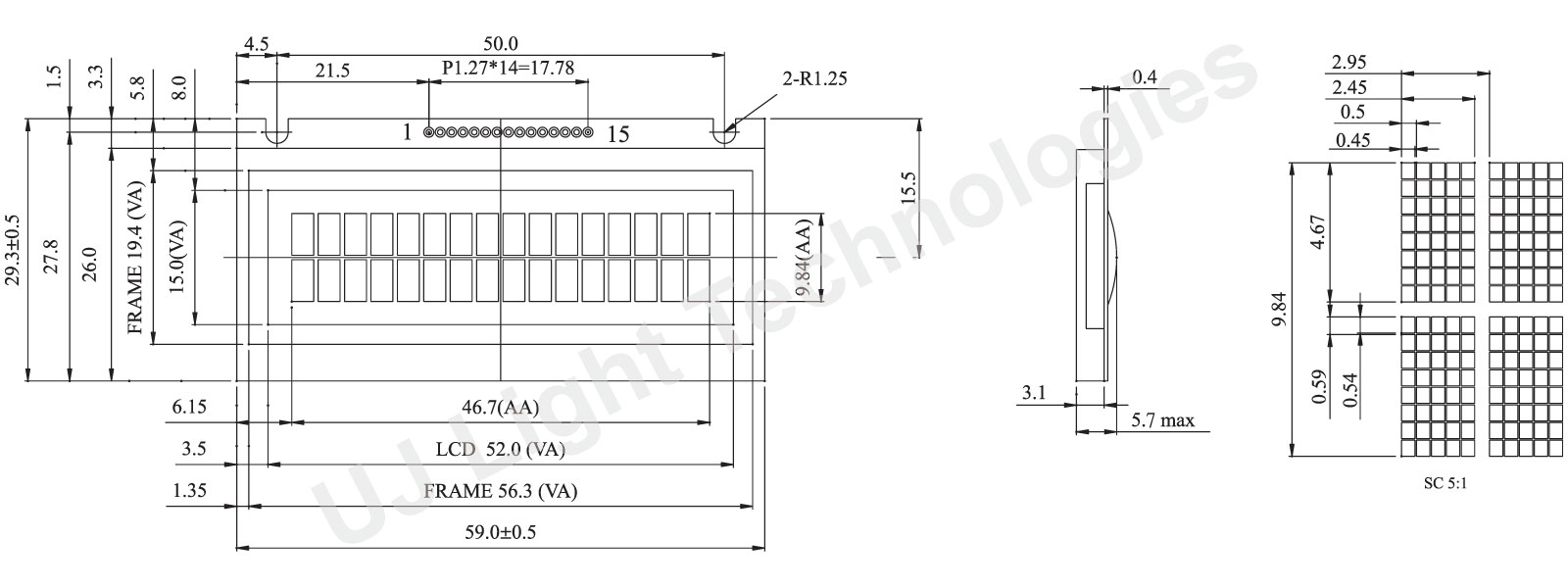 Module dimension of UC1602K is (59.0x29.3) mm and viewing area is (52.0x15.0) mm.
