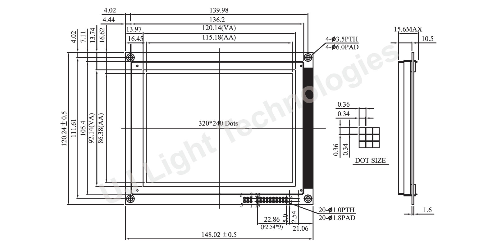 Module dimension of BG320240B1 is (139.98x120.24) mm and viewing area is (120.14x92.14) mm.