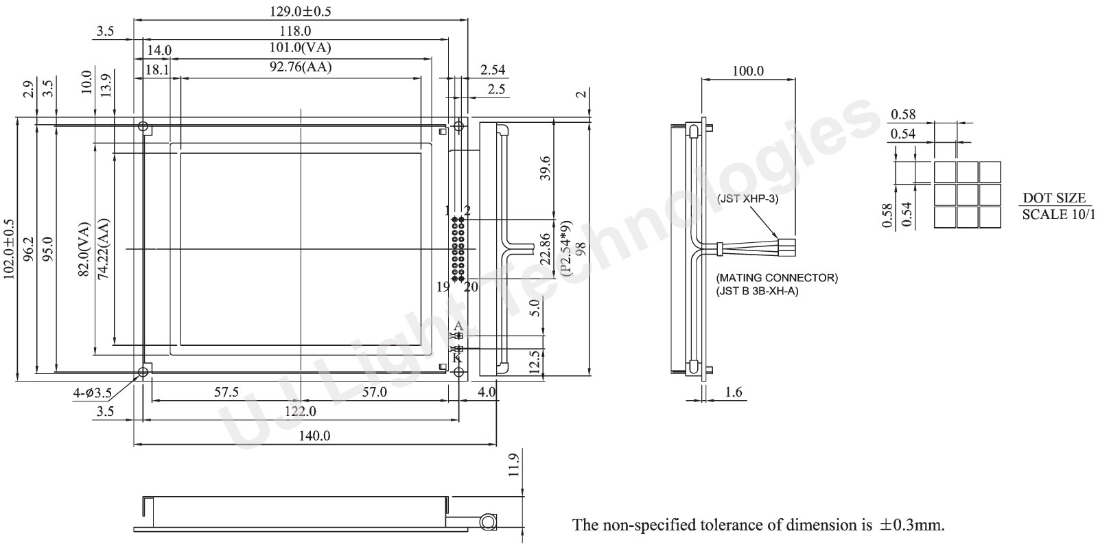 Module dimension of UG160128B is (129x102) mm and viewing area is (101x82) mm.