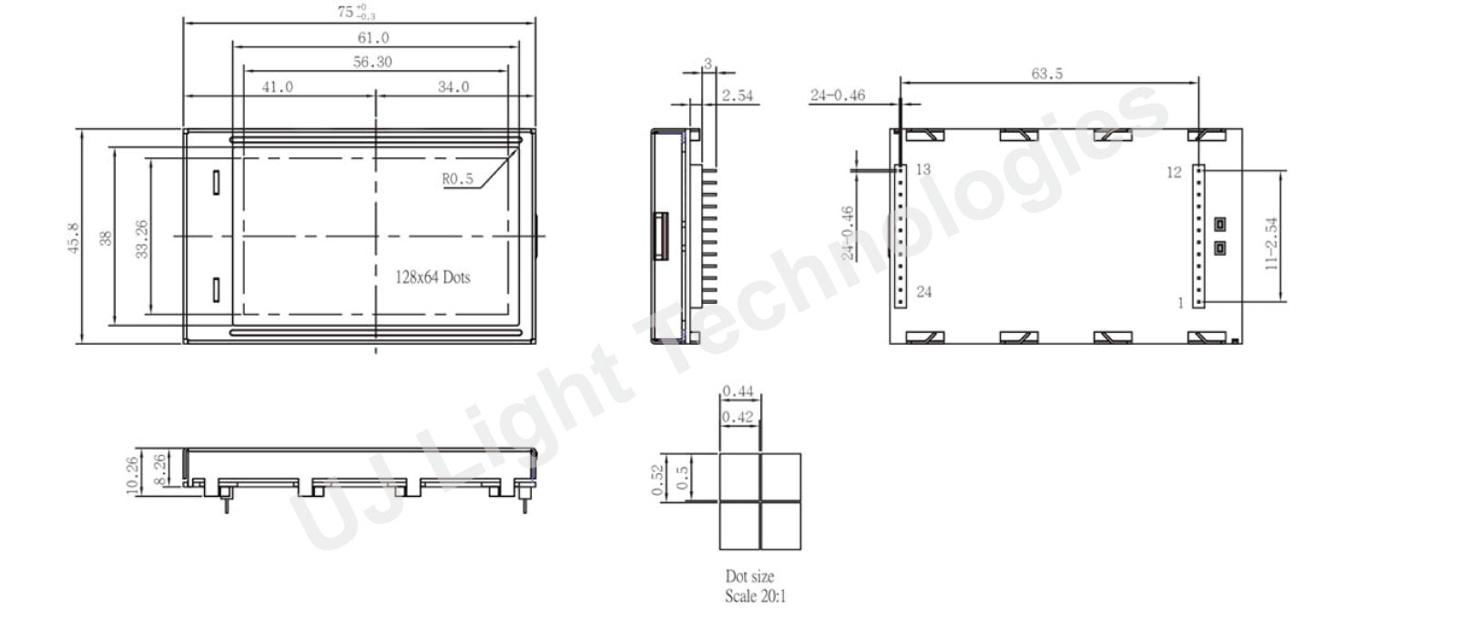 Module dimension of UG12864J is (75x45.8) mm and viewing area is (61x38) mm.