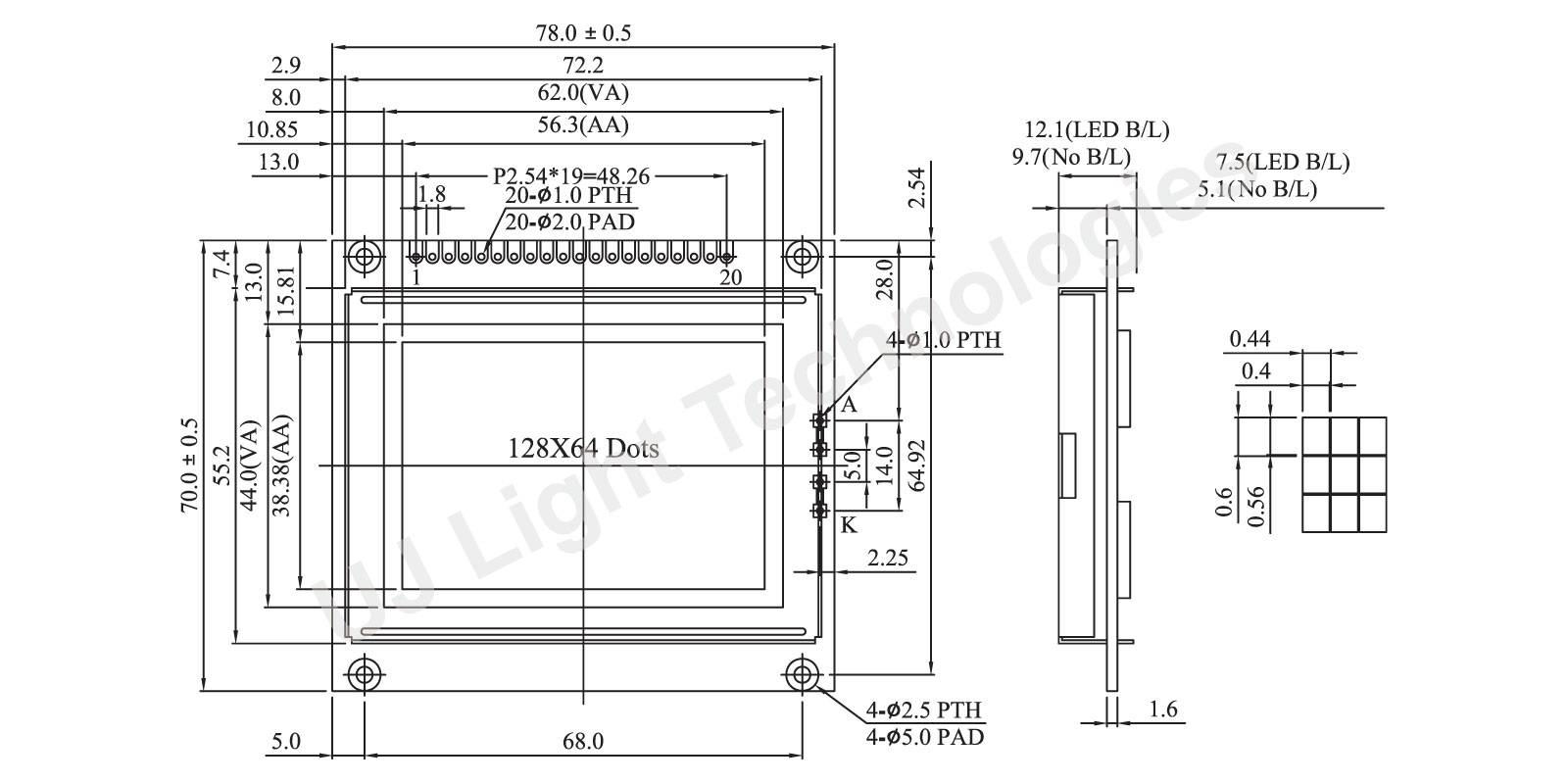 Module dimension of UG12864C1 is (78x70) mm and viewing area is (62x40) mm.
