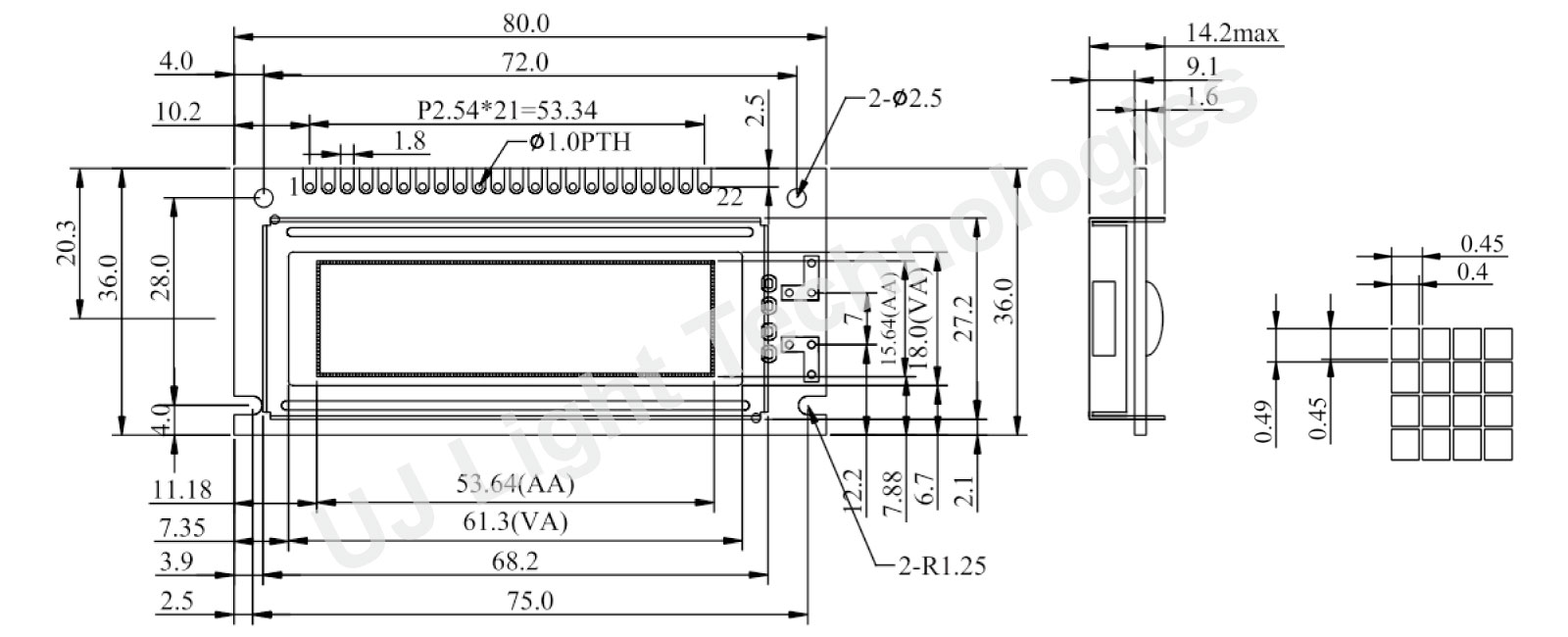 Module dimension of UG12232D2 is (80x36) mm and viewing area is (61.3x18) mm.