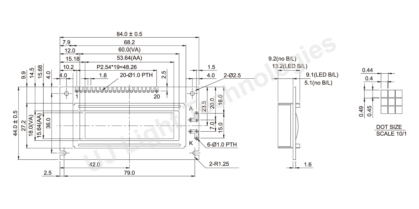 Module dimension of UG12232A1 is (84x44) mm and viewing area is (60x18) mm.