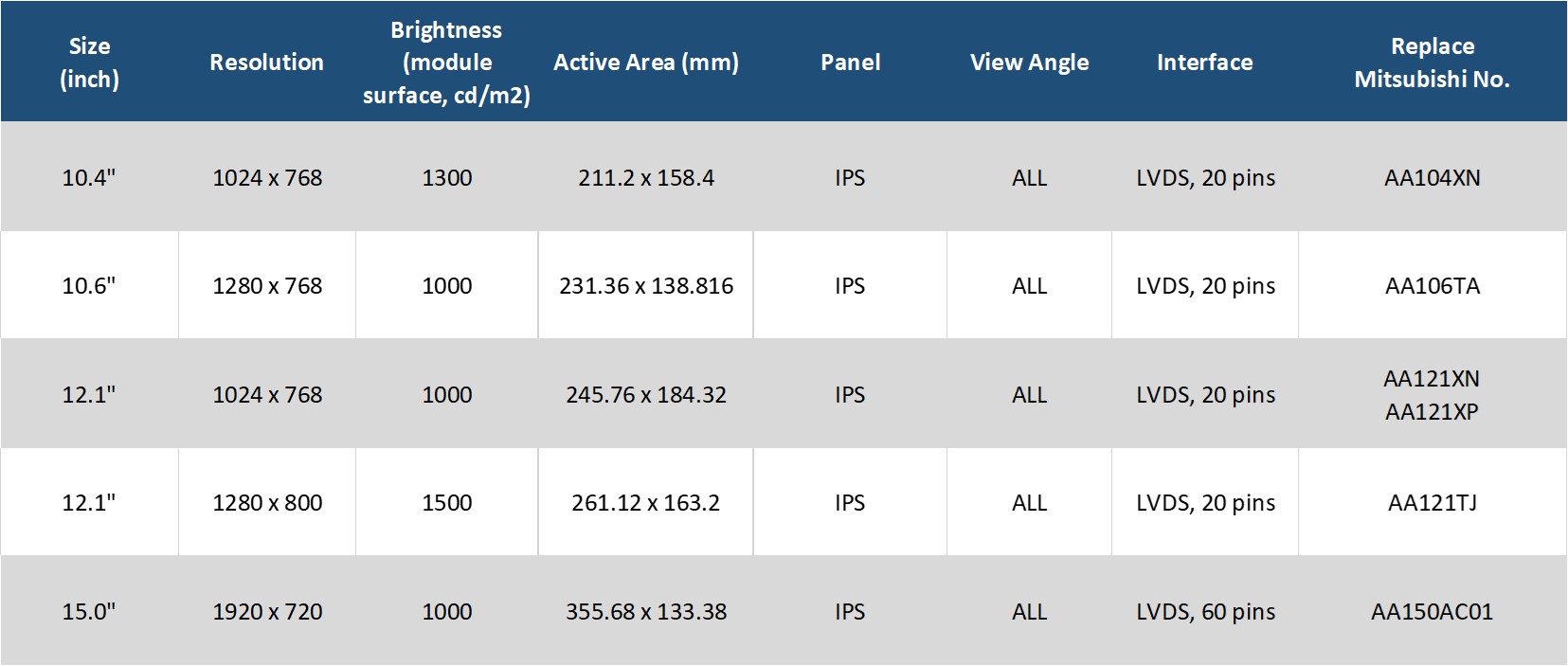 UJ Light introduces a new product line. We offer a series of new display modules to replace the Mitsubishi TFT LCD. The features of display and recommended models are as following: